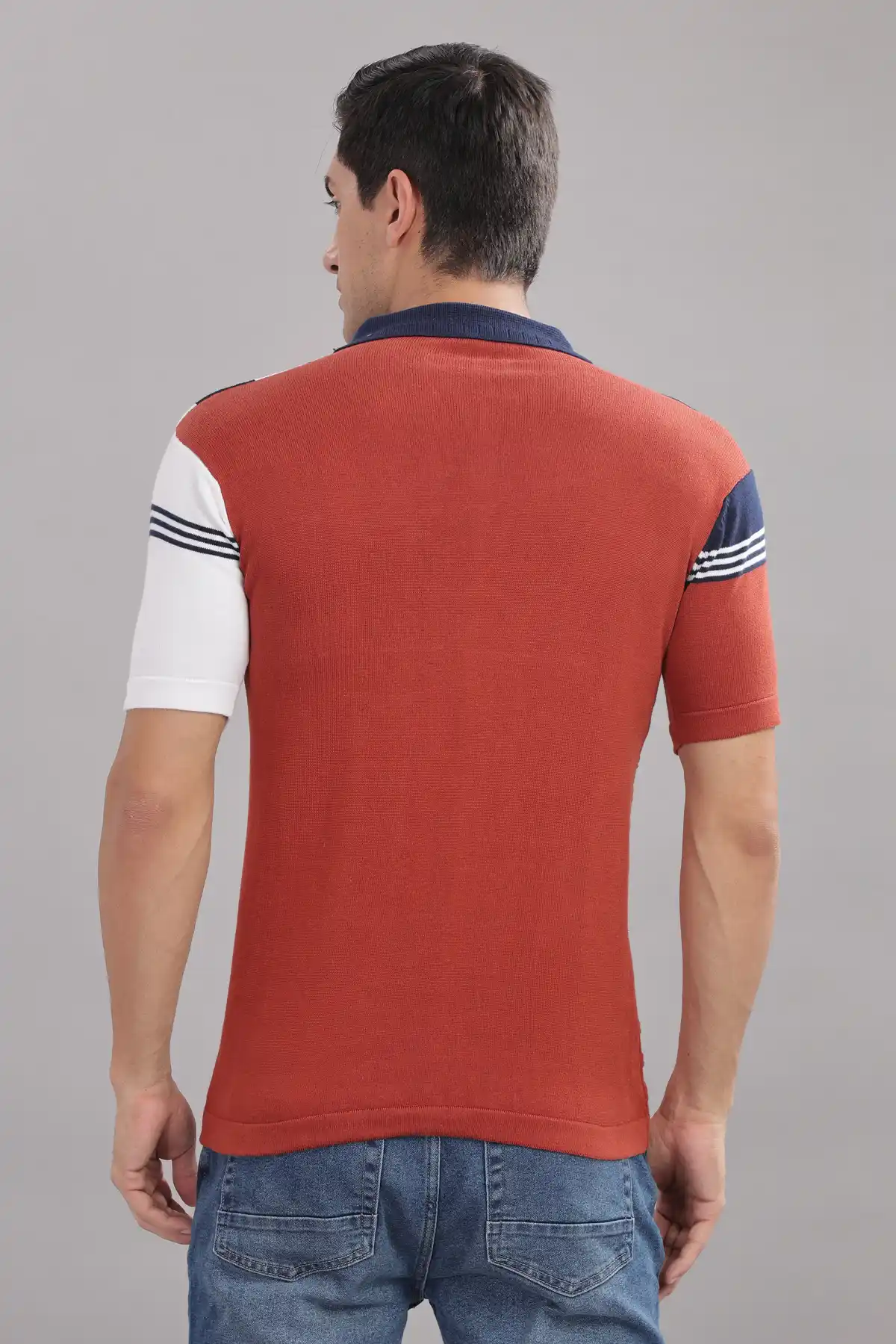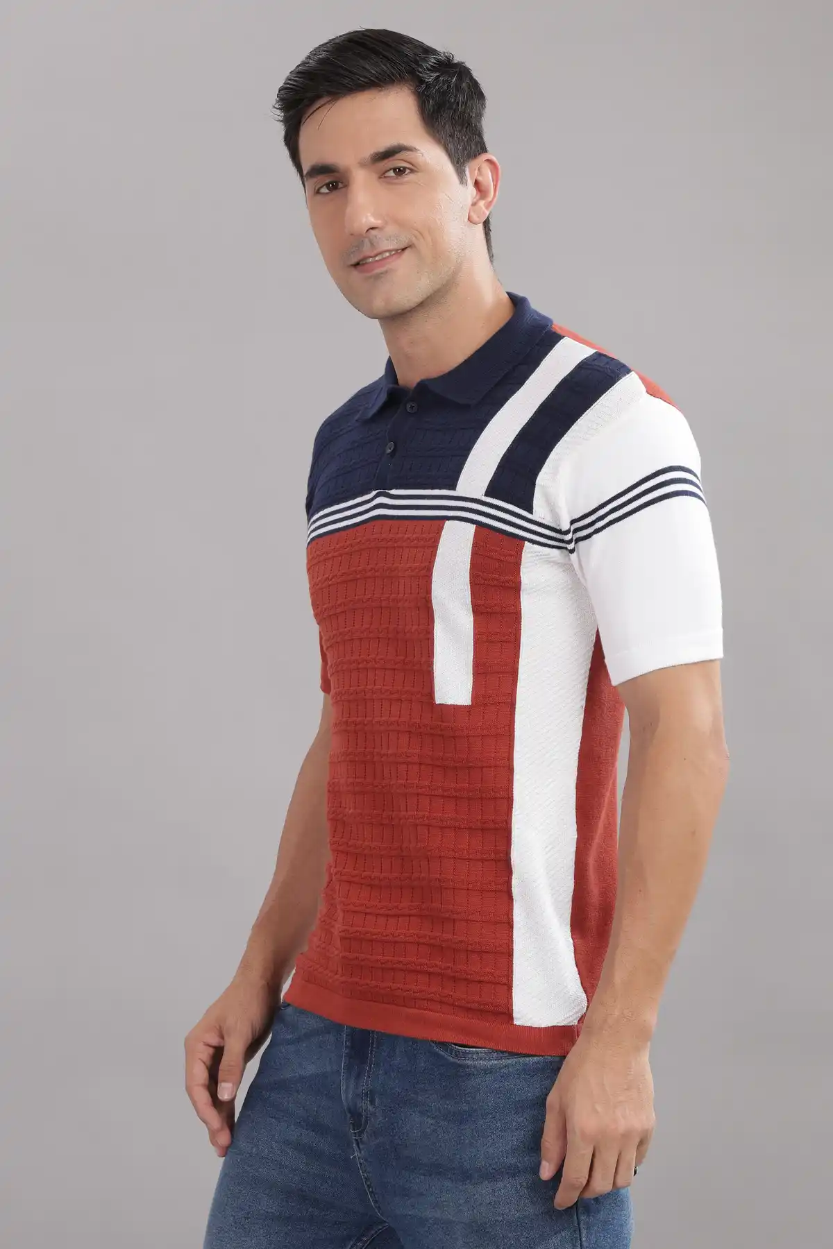 Featuring a bold red and dark blue striped pattern with a regular fit, this T-shirt offers a stylish and versatile appeal. The classic round neck design enhances its everyday wearability, making it perfect for casual outings, daily wear, or relaxed weekend styling.