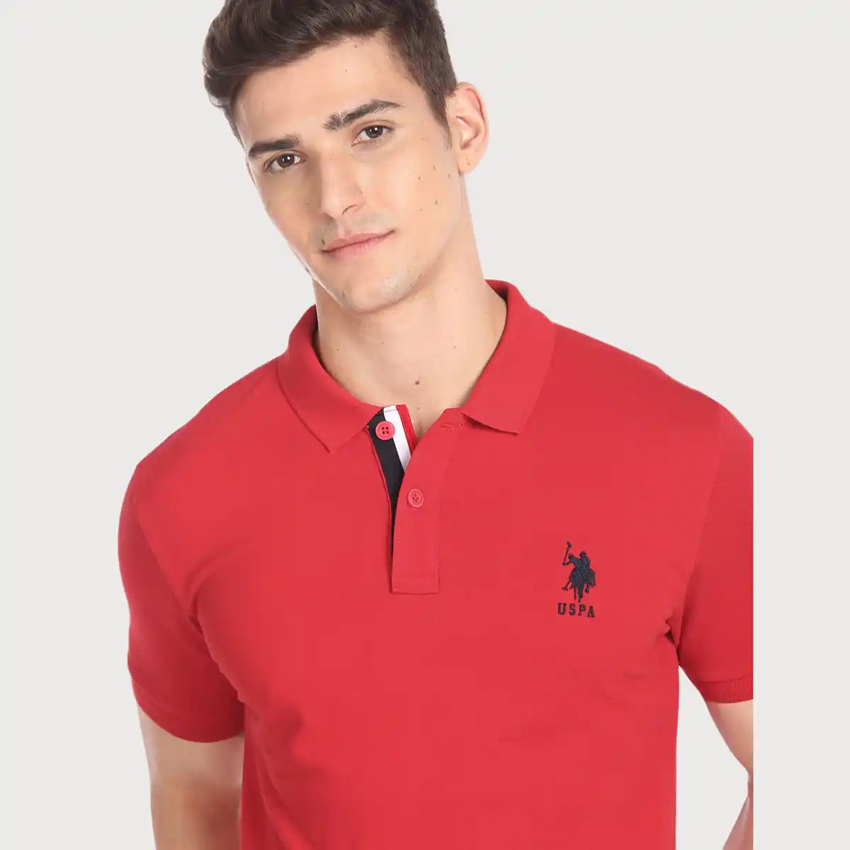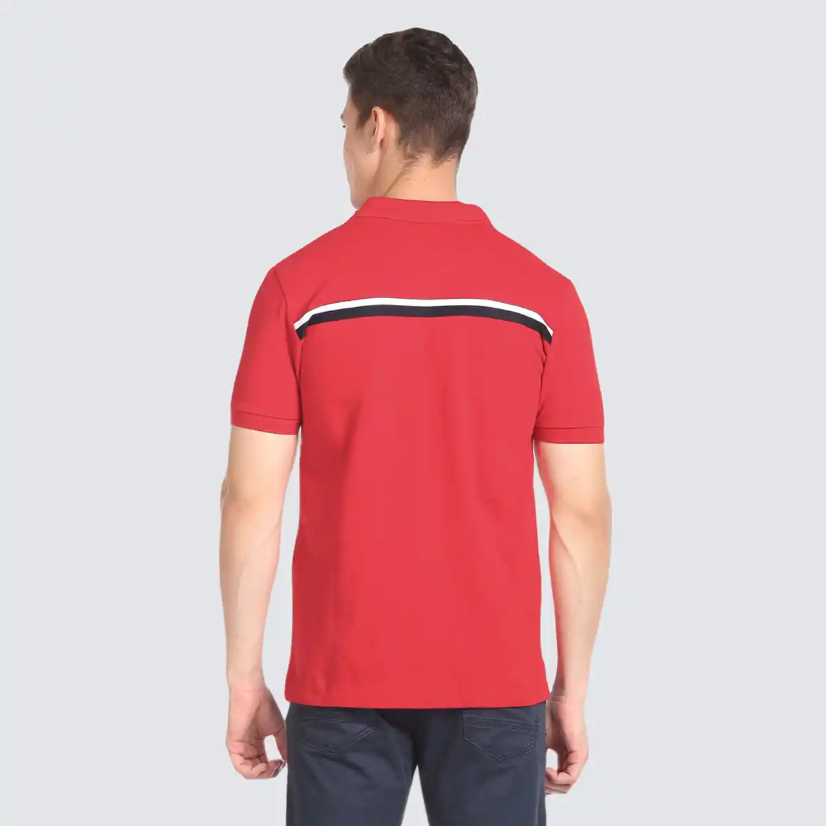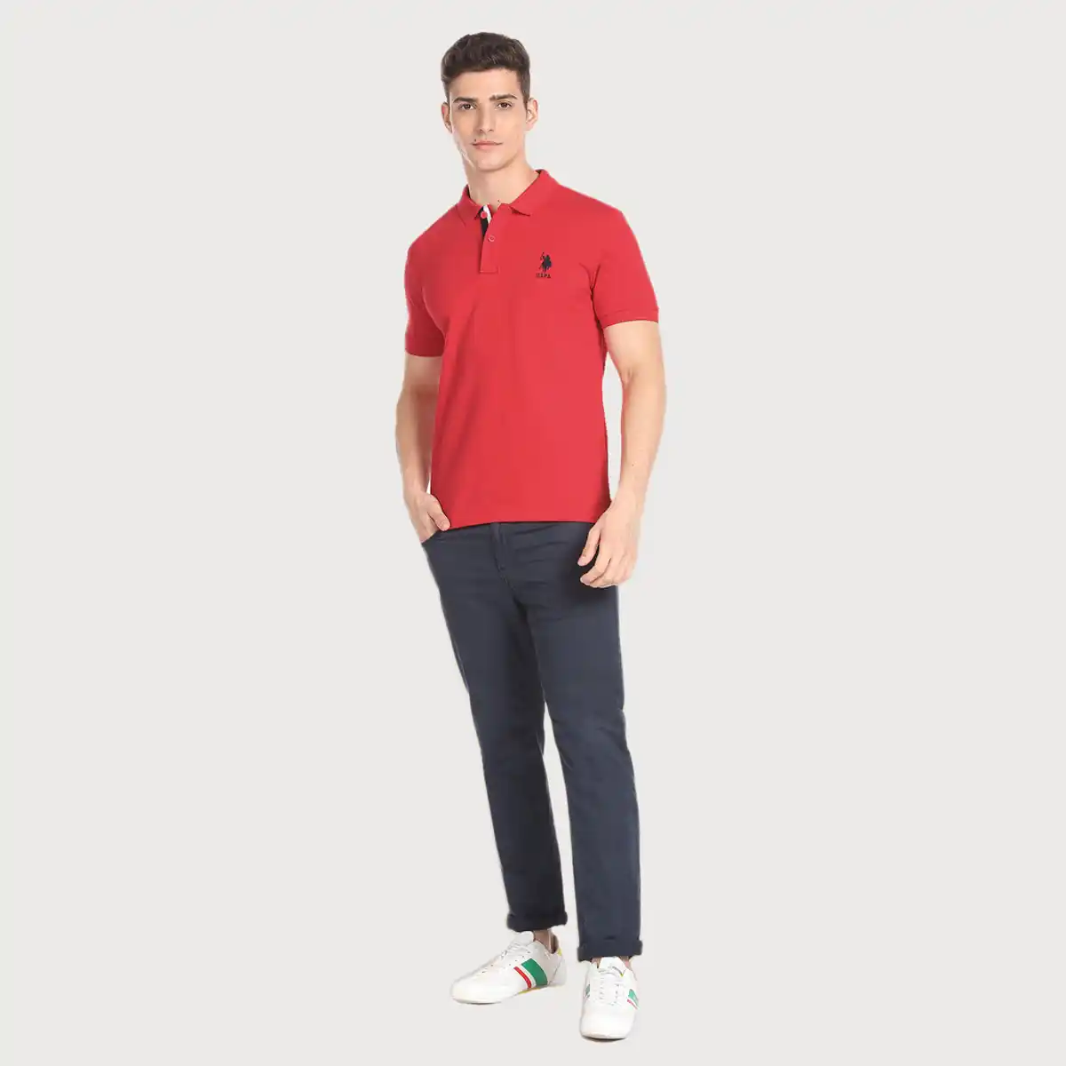 Designed in a bold red color with a slim fit, this polo T-shirt creates a sharp and stylish look. The classic polo collar and short button placket add a refined touch, while the embroidered chest logo enhances the brand appeal. Perfect for casual outings, weekend wear, or smart-casual styling.